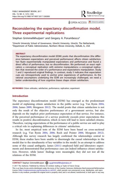 [Abstract]The expectancy disconfirmation model (EDM) posits that disconfirmation (the difference between expectations and perceived performance) affects citizen satisfaction. Van Ryzin experimentally manipulated expectations and performance and found a direct effect of performance, but no disconfirmation. We performed: an exact replication; a conceptual replication with extreme manipulations; a conceptual replication that reversed the order of a performance and expectations manipulation. Study 1 and 2 reproduced original findings. In contrast, study 3 indicates that expectation cues are retrospectively used to anchor prior experiences of performance. As the rational assumptions underlying the EDM are increasingly challenged, we need a better understanding of how cognitive biases shape ci..