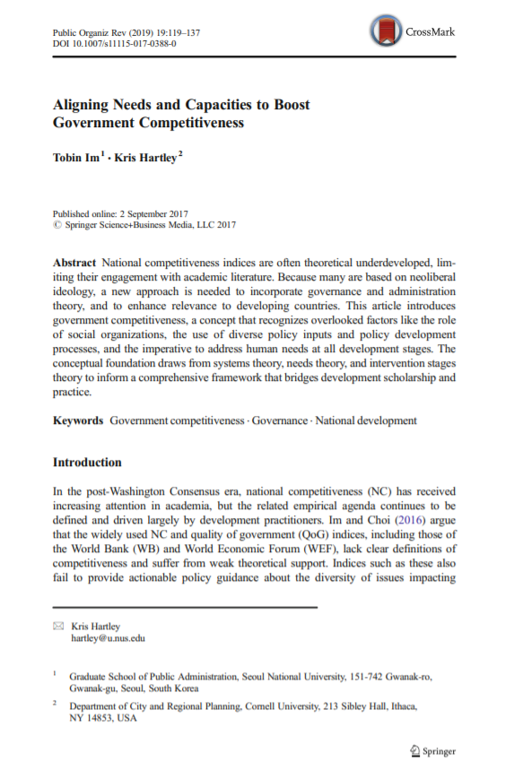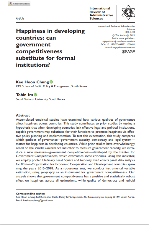 Accumulated empirical studies have examined how various qualities of governance affect happiness across countries. This study contributes to prior studies by testing a hypothesis that when developing countries lack effective legal and political institutions, capable government may substitute for their functions to promote happiness via effecꠓtive policy planning and implementation. To test this expectation, this study compares which qualities of governance—government capacity, democracy, and legal system—matter for happiness in developing countries. While prior studies have overwhelmingly relied on the World Governance Indicator to measure government capacity, we introꠓduce a new measure—government competitiveness—developed by the Center for Government Competitiveness, which overco..